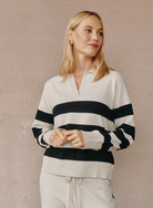Soft and cozy, the Stripe Placket Pullover Sweater in Oat & Black blends polished detail with an easy, lightweight feel.