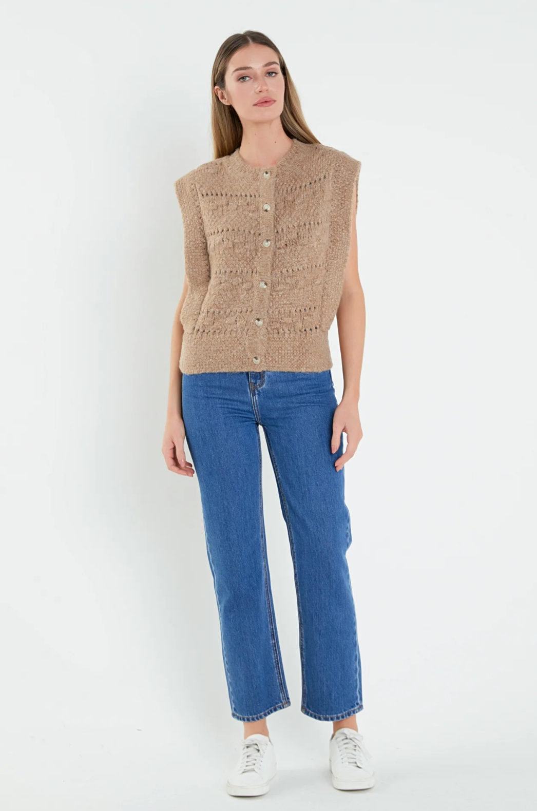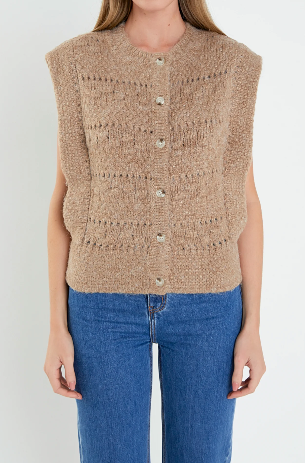 Our Chunky Textured Knit Vest is an ultra-comfortable outerwear item perfect for the cooler months. Featuring a front button-down closure and shoulder padding for added warmth and comfort this vest is perfect for any occasion. With the distinctive texture of the knit fabric, you'll look both stylish and cozy. Discover unbeatable comfort and unparalleled style in this Chunky Textured Knit Vest.