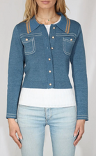 Denim-look button front cardigan sweater.