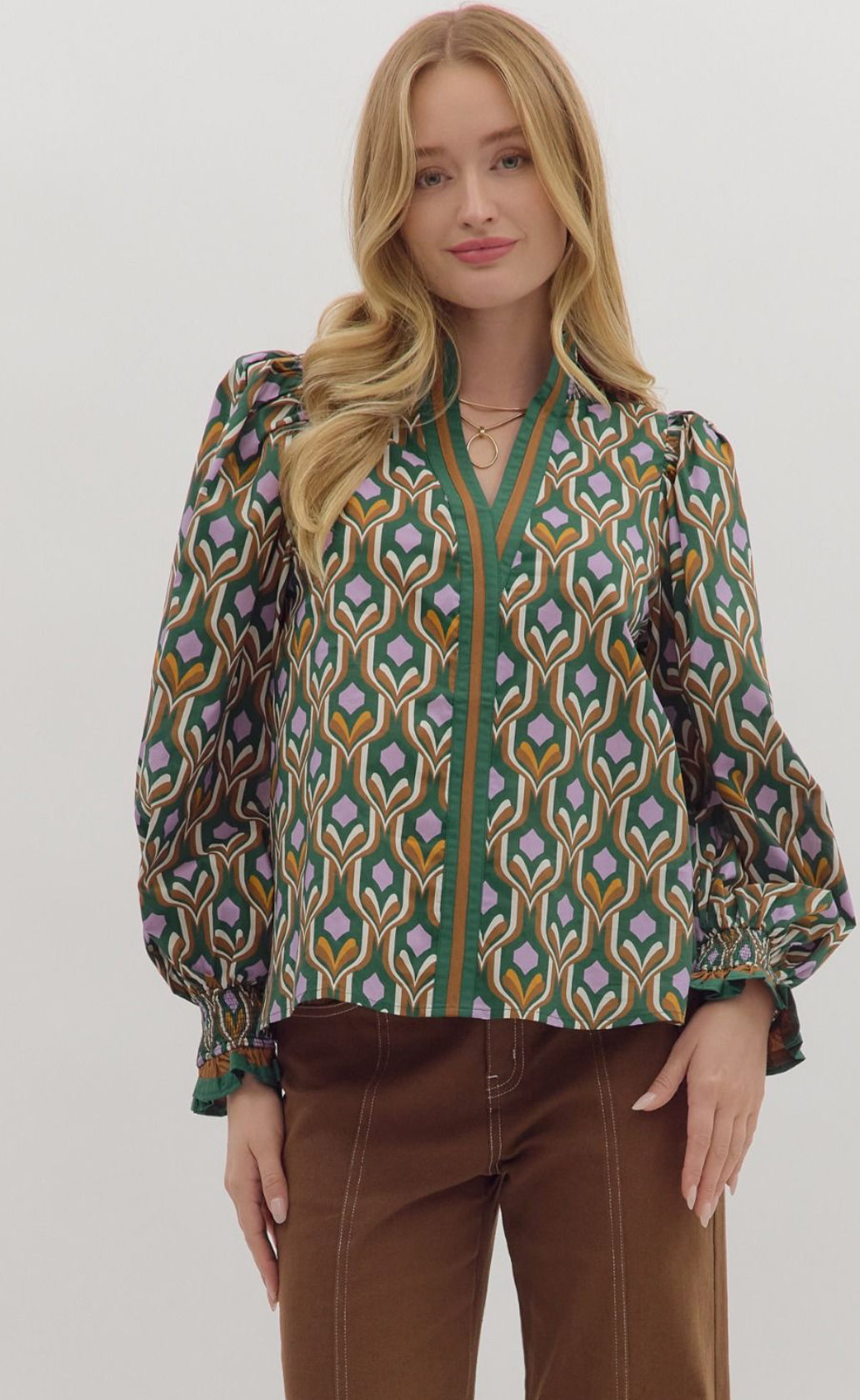 Geometric print long sleeve top with v-neckline and smocked detail at cuffs. 100% Cotton.