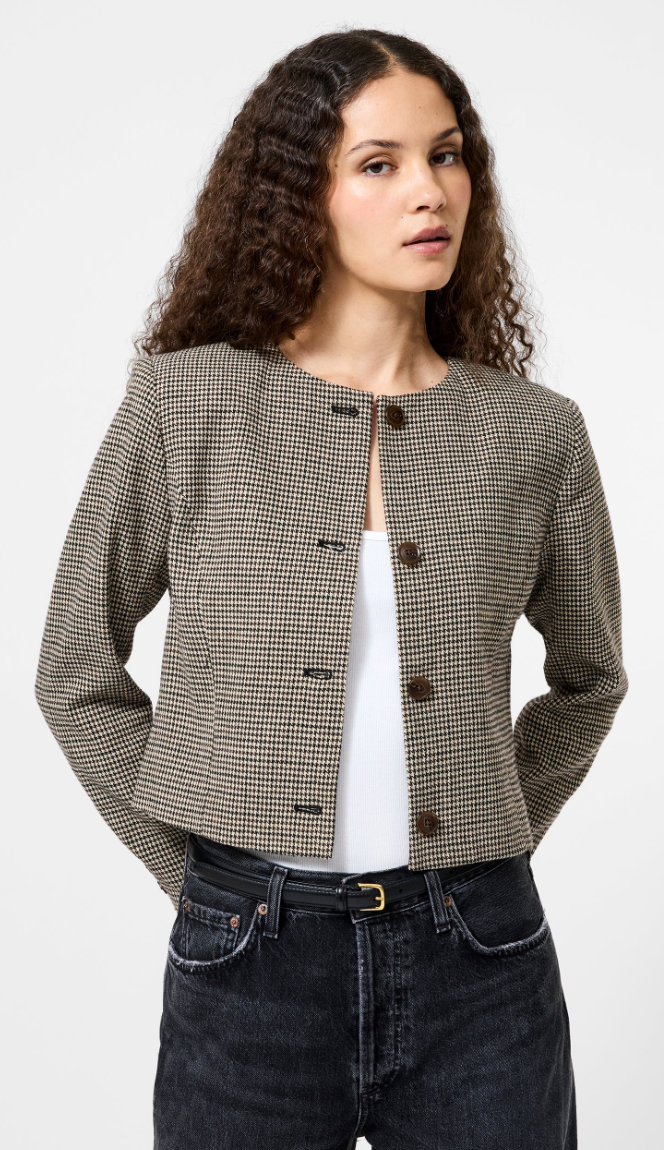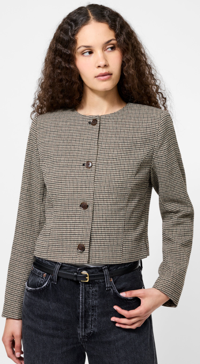 The Houndstooth Wool Jacket is a no-fuss, tailored essential. Made from our wool blend suiting in a timeless houndstooth, this collarless cropped jacket keeps things sharp and streamlined. Dress it up with a matching skirt or down with denim—either way, it pulls your look together instantly.