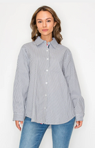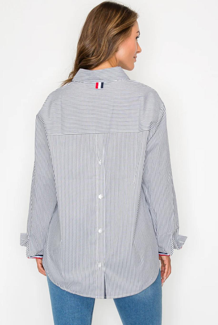 The Jasmine Top features a sophisticated stripe design and a button down collar, perfect for fall. The long sleeves and open back add a touch of elegance, while the trim label and button back provide subtle details. Elevate your wardrobe with this stylish and versatile top.