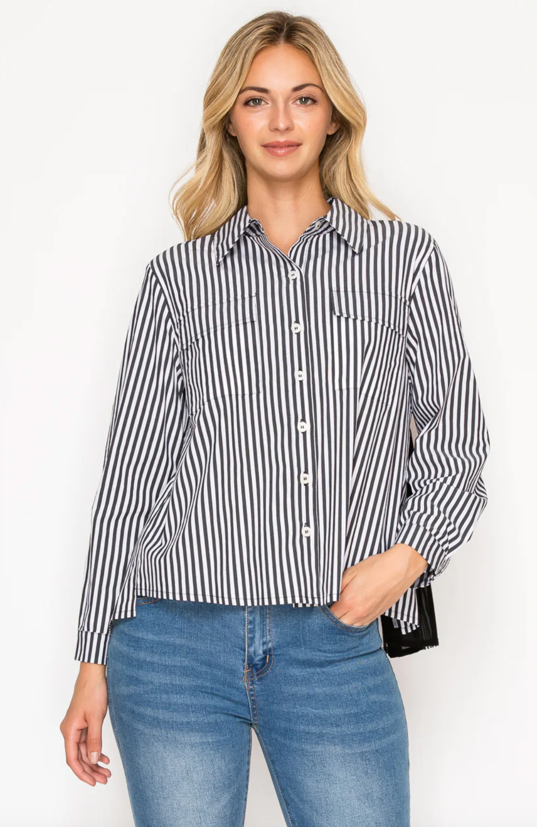 A classic sophisticated pinstripe with a modern flare. Collar, button front, and long sleeves. Pleated detail in the back. Easy relax fit. Stylish and comfort.