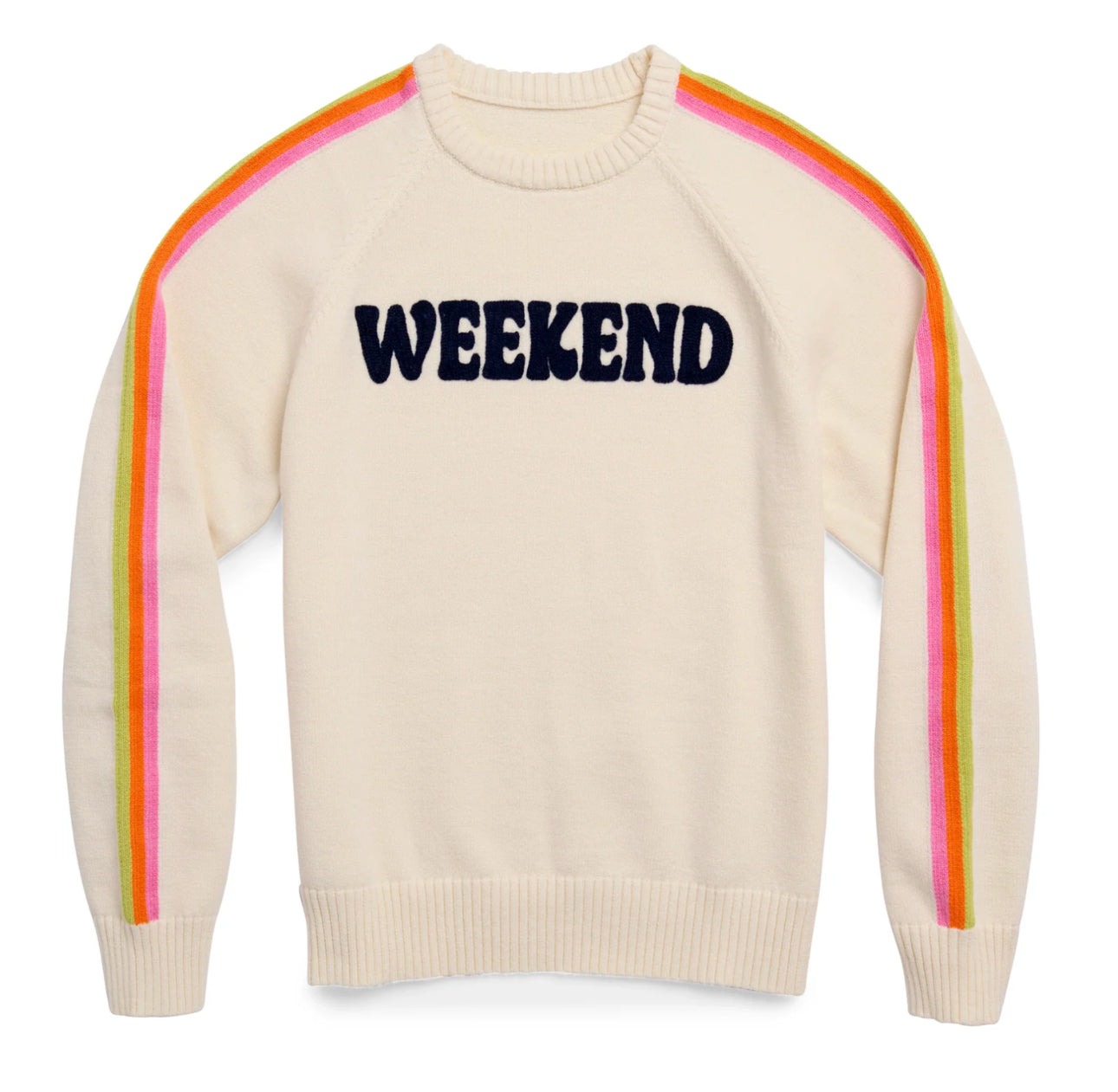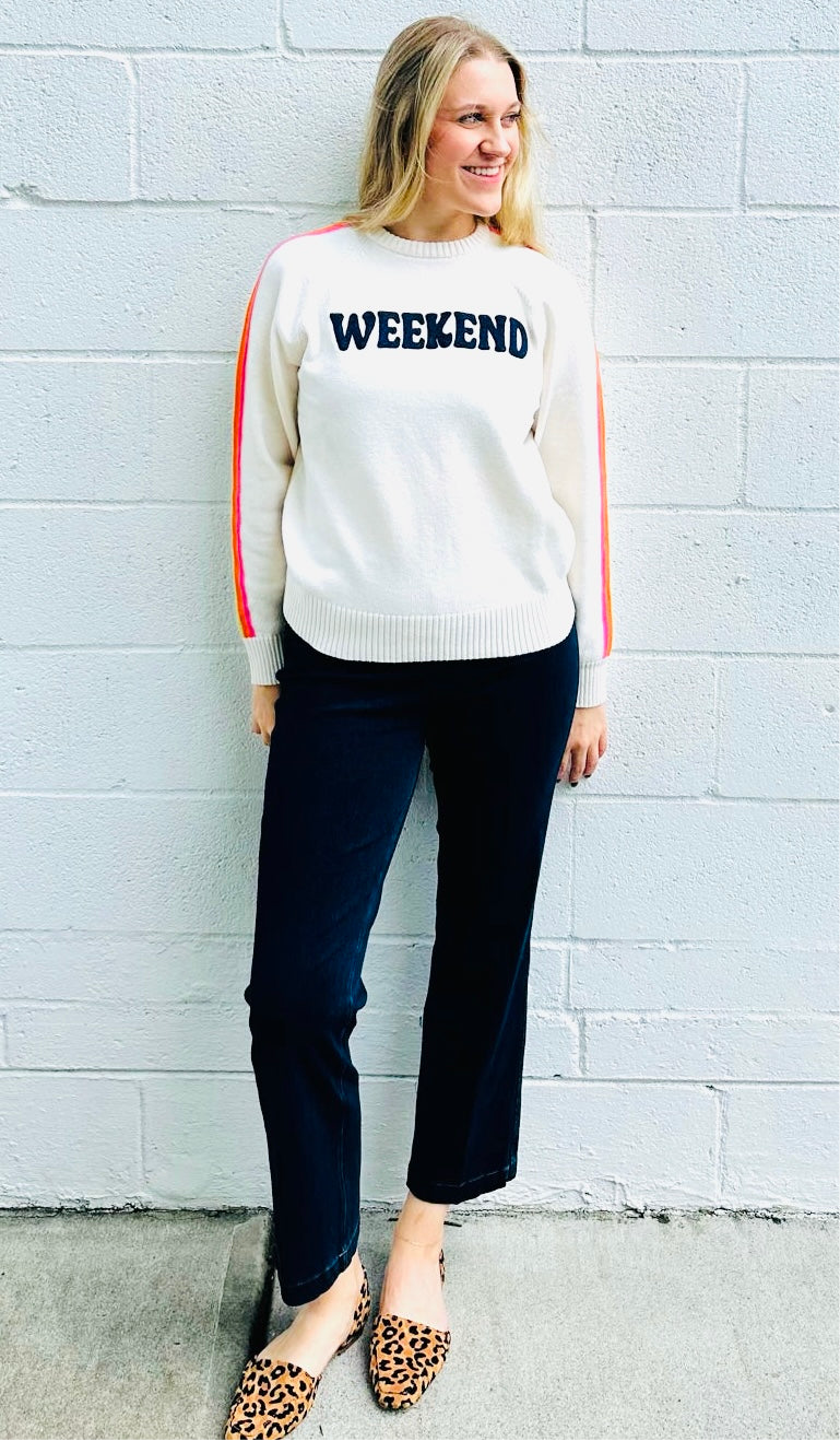 Say hello to your new weekend uniform! The "Weekend" Sweater brings cozy comfort and playful charm with its soft ivory knit and retro-inspired navy lettering. Rainbow stripes down the sleeves add a cheerful pop of color that’s perfect for brunch runs, coffee dates, or lazy Sundays. With its relaxed fit and vibrant vibes, this sweater is all about kicking back in style.
