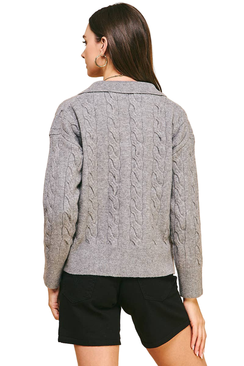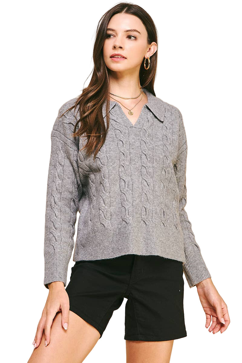 CABLE KNIT COLLARED SWEATER TOP - HEATHER GREY