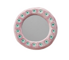 This charming 5-3/4" round stoneware mirror features a playful polka dot design in pink and blue. Perfect for adding a touch of whimsy to any room, this mirror is both functional and decorative. The handcrafted stoneware frame adds a unique touch, making it a standout piece in any space. Hang it in a nursery, bedroom, or playroom for a fun and colorful accent. This mirror is sure to brighten up any room and make a statement with its cheerful design. Add a pop of color and style to your home with this adorable stoneware mirror.