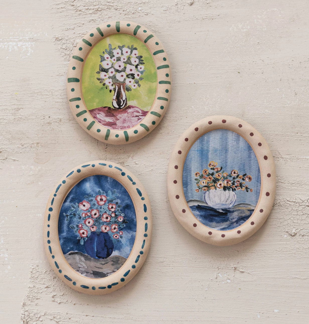 4-1/2"W x 5-3/4"H Stoneware Plate Wall Décor w/ Flowers in Vase, Multi Color, 3 Styles (Hangs or Sits)