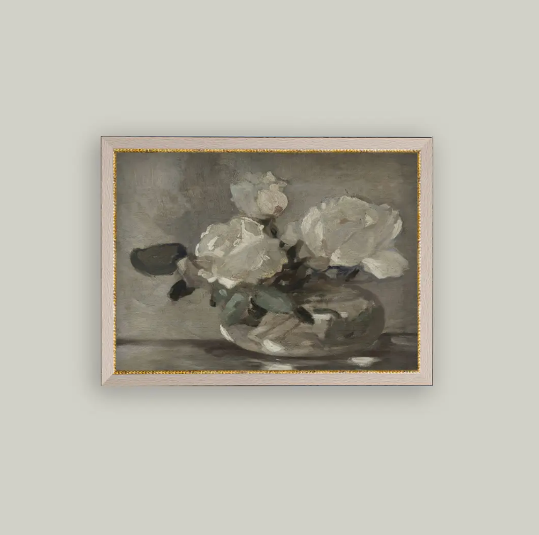 White rose vase framed antique art is printed on quality canvas, giving it a lasting finish, then placed into our handcrafted Fancy Gold frame. This is an authentic reproduction of the original artwork.