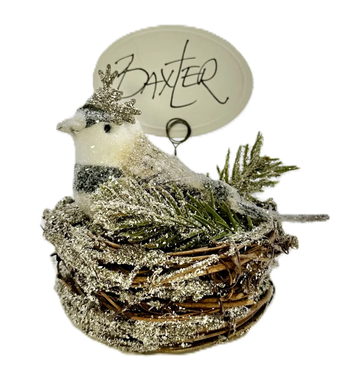 Our charming little bird brings a touch of enchantment to your celebrations. Dusted with sparkling glitter, this feathered friend glimmers with a magical glow, while its delicate silvered crown adds a regal flair. Perched gracefully in a wrapped twig nest and pine needles, brushed with lustrous German silver glass glitter, the bird radiates elegance and whimsy. A spiral wire card holder rises from the nest, making it perfect for displaying place cards, photos, or special notes. Whether used for weddings, holiday gatherings, or everyday décor, this whimsical accent adds a sprinkle of joy and sophistication to any setting.