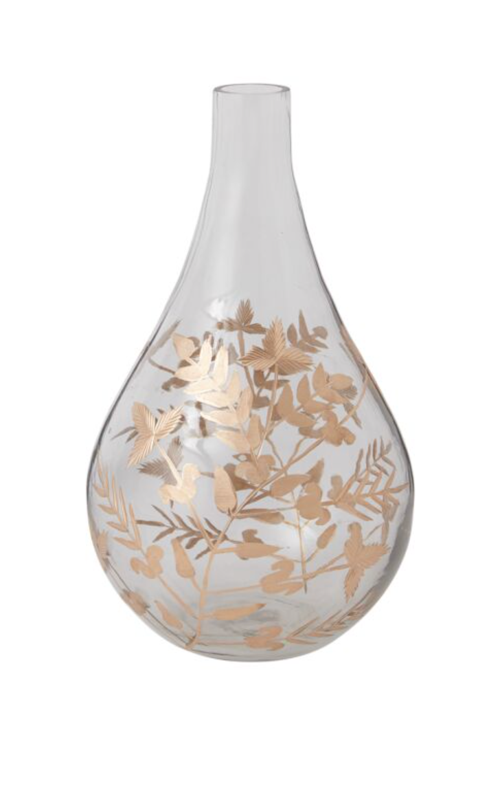 Statement making on its own, the Gild Leaf Vase is a large scale bulb shaped vase that has tapered neck, and gold etched leaves on a clear base. Styled with branches and fresh florals, this vase makes a lovely centerpiece for a holiday table.