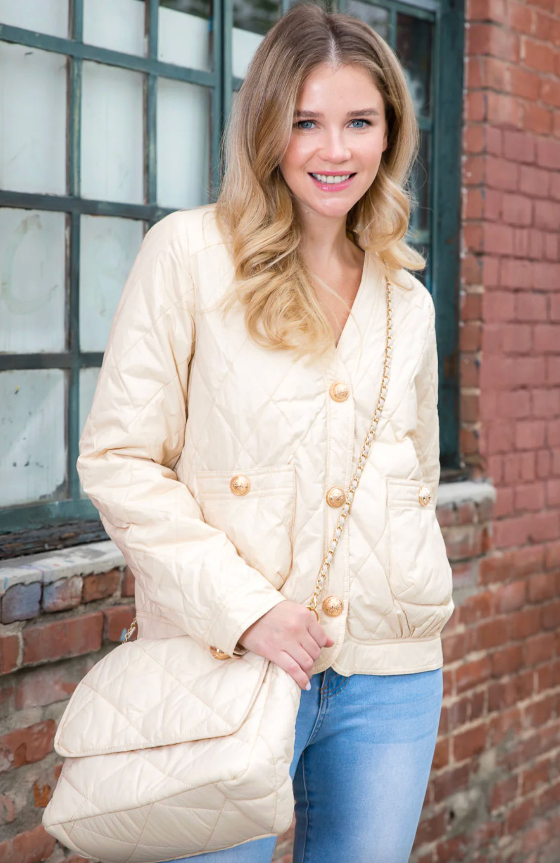 Our Johya puffer jacket. Easy relax fit. Comfort, and style. Jacket has gold trimmed snap buttons for easy closure. Light weight, keeps you warm and stylish.