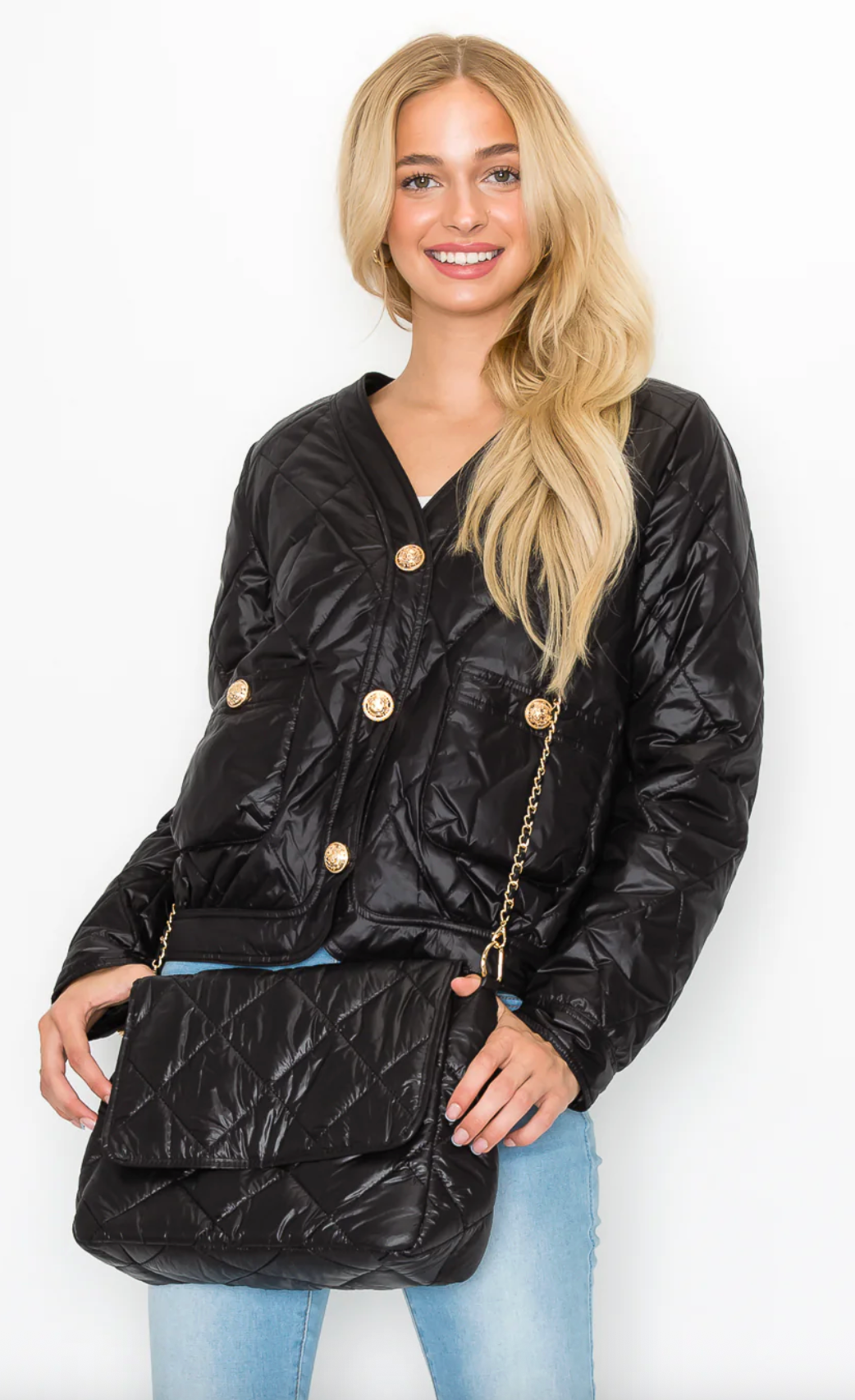 Our Johya puffer jacket is an easy relaxed fit with comfort and style. Jacket has gold trimmed snap buttons for easy closure. Light weight, keeps you warm and stylish.