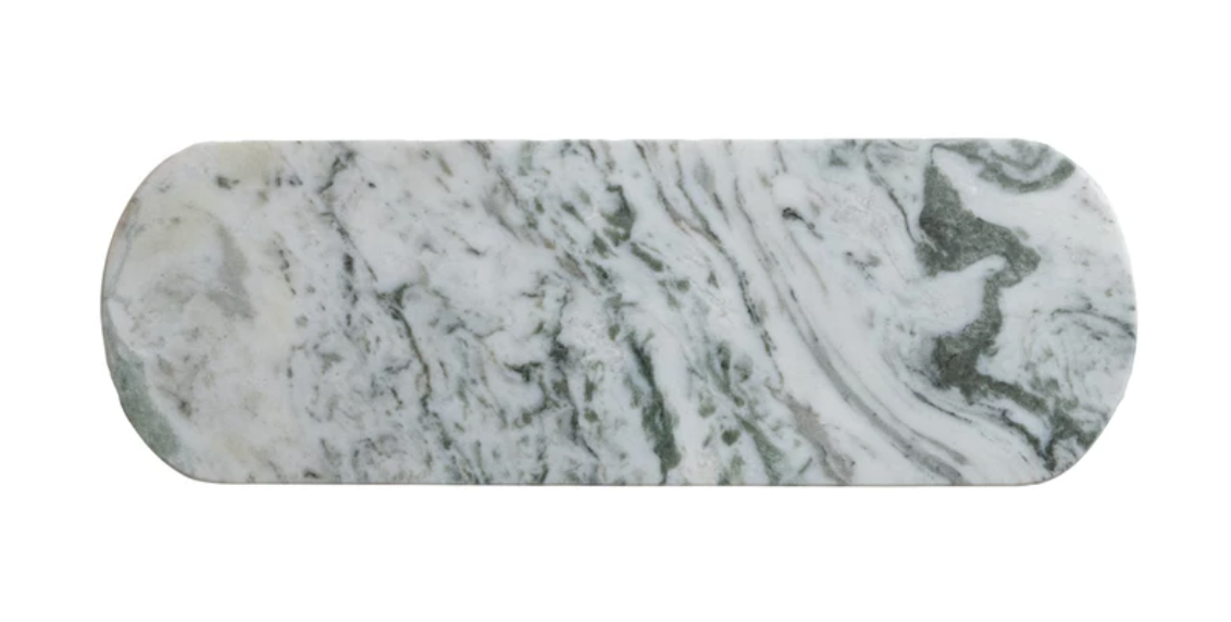This Marble Cheese Cutting Board features a green mélange that captures the eye and elevates the presentation of any cheese. The oval shape lends a contemporary feel, while the marble construction ensures durability and a cool surface to preserve the freshness of delicacies. Designed to harmonize with modern, boho, and minimalist aesthetics, it's a versatile piece that's as practical as it is beautiful. It measures 18 inches in length and 6 inches in width, making it the perfect size for an array of gourmet selections. Its generous dimensions make it an ideal platform for both preparation and presentation, ensuring it becomes an essential part of every entertaining repertoire. (Each one will vary)