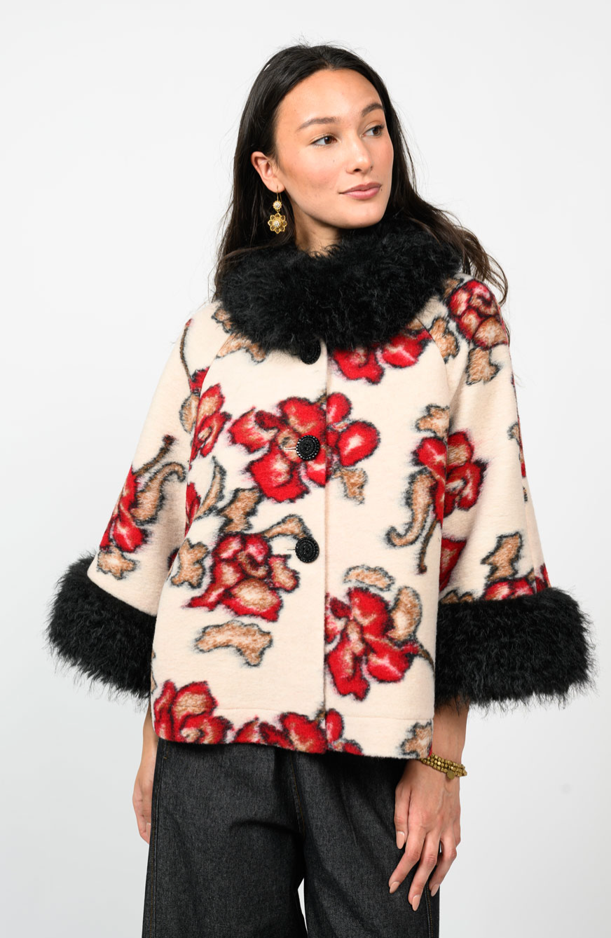 Faux fur button front jacket with floral pattern and fur cuffs and collar trim.